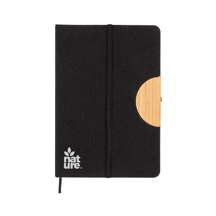 Bloco tamanho A5 com capa rpet 300d, suporte para smartphone e detalhe em bambu. Inclui 80 folhas lisas, marcador, fecho elástico e porta-canetas com certificação fsc.