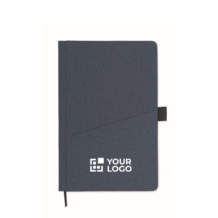 Bloco de notas A5 com capa dura em PU e bolso frontal para telemóvel. Encadernação em caixa. 160 páginas pautadas em papel reciclado (80 folhas). Marcador de livros com fita a condizer.