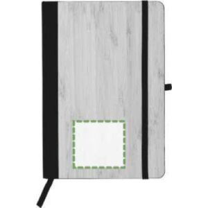 Caderno com capa de bambu (aprox. A5) revestido com PU. Tem 96 páginas pautadas e faixa elástica.