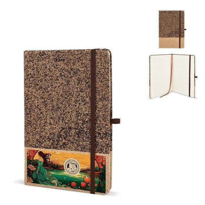 Caderno A5 com uma capa exclusiva de cortiça e café moído. Com fecho elástico, porta-caneta e marca-página. Inclui 80 folhas pautadas de cor creme feitas de papel com certificação FSC. Uma escolha natural e distinta.
