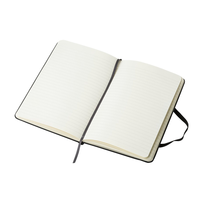 Caderno de capa dura em cartão com acabamento resistente, em tamanho médio para uma utilização diária confortável. Inclui cantos arredondados, fecho elástico e fita marcadora para localizar notas rapidamente. O interior oferece 208 páginas pautadas em papel cor de marfim, pensadas para escrita contínua em reuniões, visitas ou trabalho de campo. Inclui bolso interior expansível para guardar cartões, talões ou documentos soltos. Conta com Certificação de Sustentabilidade Florestal. Útil como oferta empresarial para formações, onboarding ou eventos com branding.