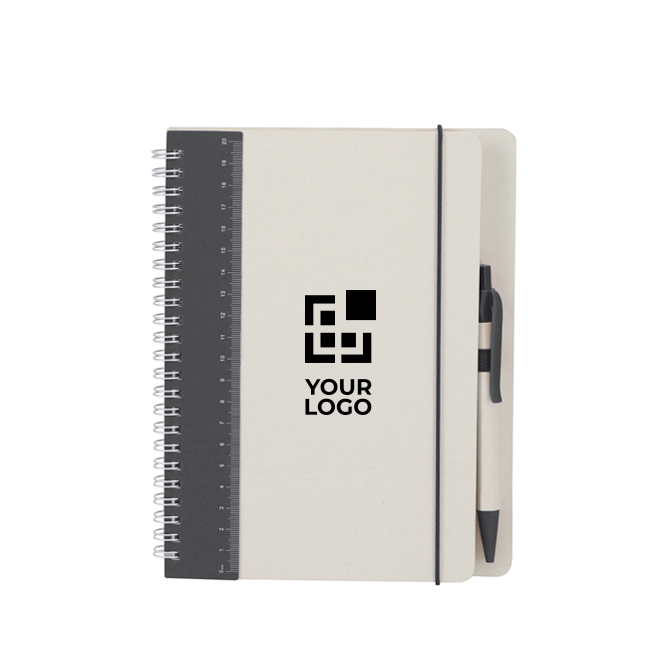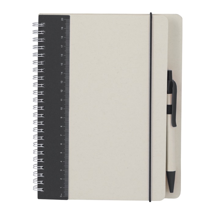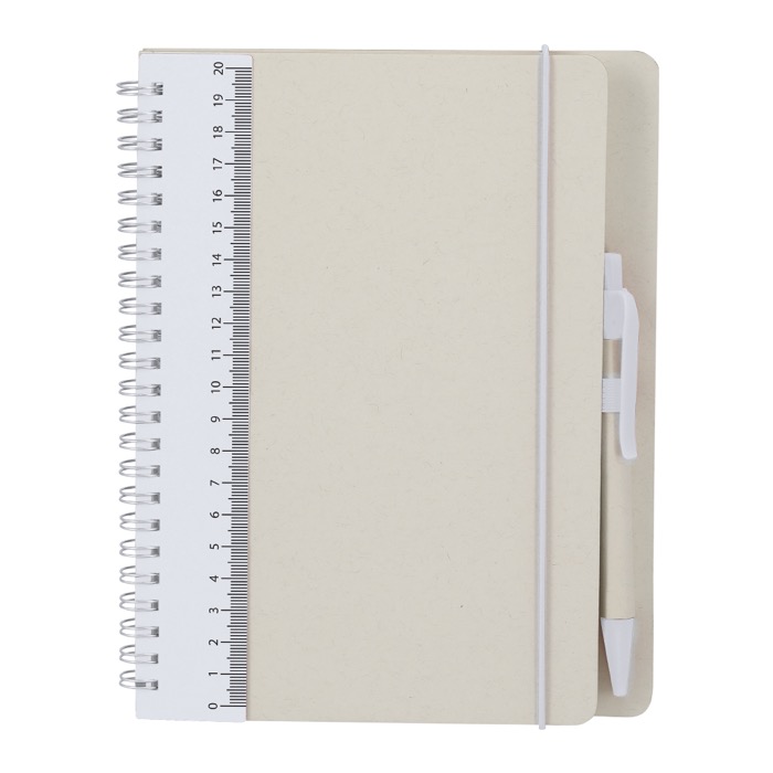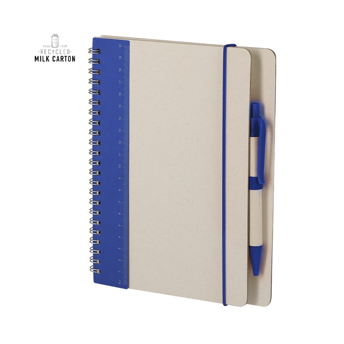 Caderno de capa dura feito de pacotes de leite reciclados, com design bicolor concebido para uso diário no escritório. Contém 70 folhas de cor natural pautadas para tomar notas ordenadamente, além de fita elástica de fecho e porta-caneta a condizer. Inclui selo Recycled Milk Carton na contracapa e nas folhas interiores. Acompanhado por uma caneta com corpo do mesmo material e clipe colorido, com escrita a tinta azul. Escolha prática para formações, convenções e ações de marca.