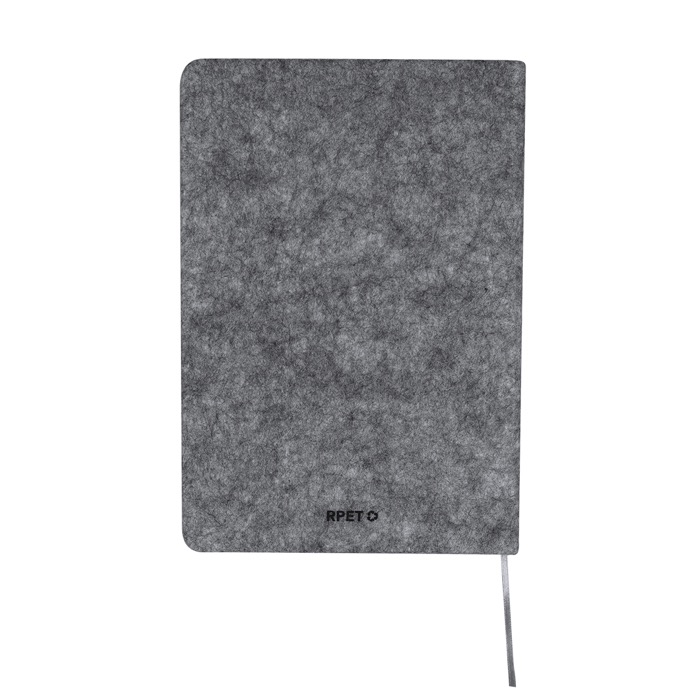 Bloco de notas com capa dura, feito de feltro rPET. Inclui um bolso de cortiça cosido na capa. Contém 80 páginas de linhas, marca-página e suporte elástico para caneta a condizer. Com logótipo rPET na contracapa. O material rPET é feito de plástico reciclado, promovendo assim a reutilização de resíduos plásticos e ajudando na sustentabilidade do planeta.