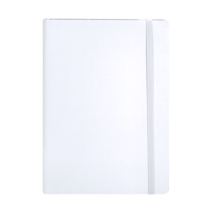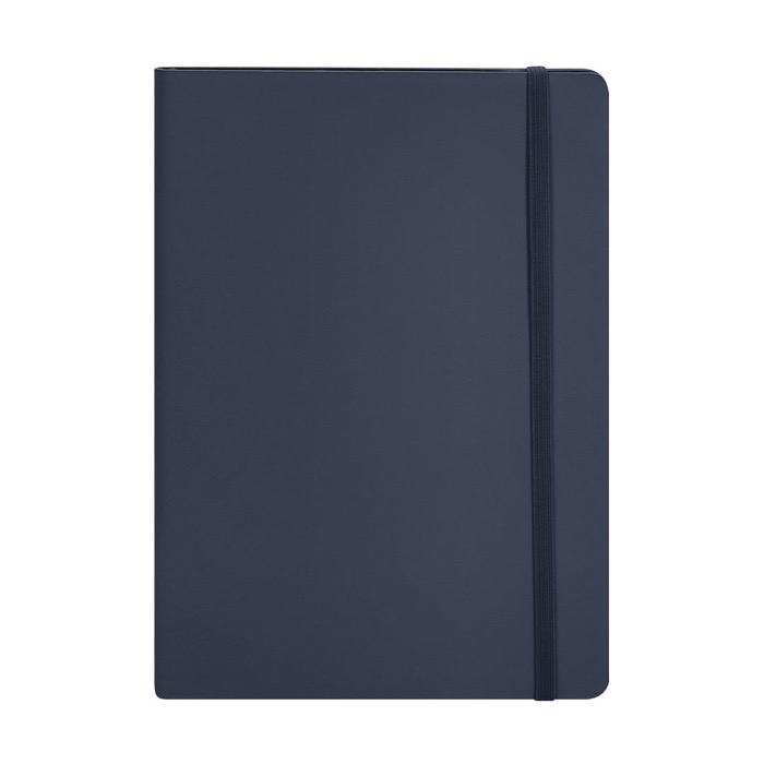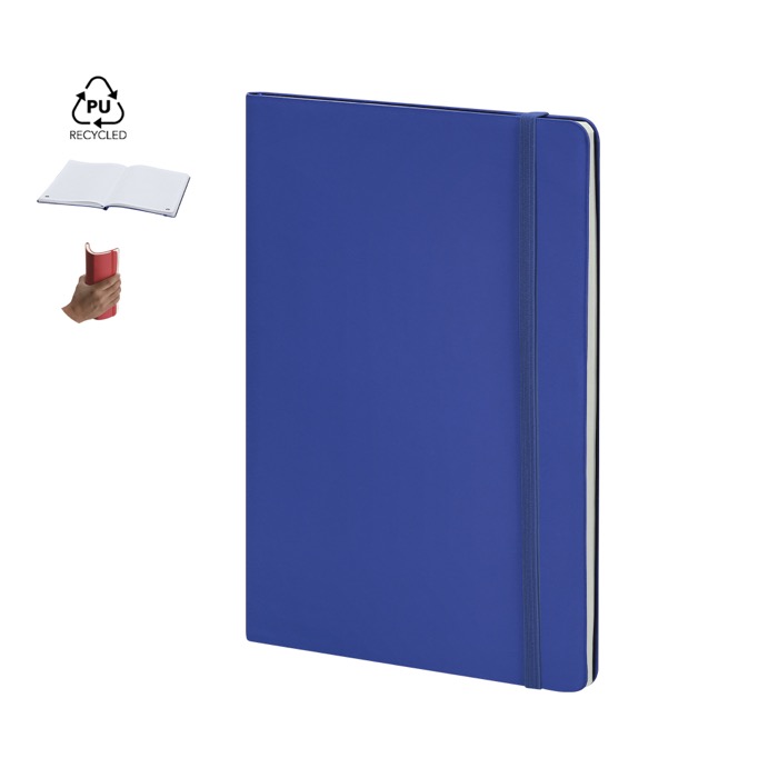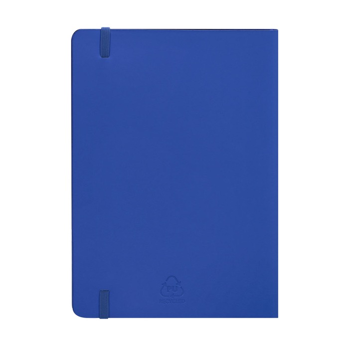 Caderno A5 com capa flexível de pele sintética reciclada, concebido para uso diário no escritório ou em movimento. Inclui marca-página e fita elástica de fecho a condizer para o manter sempre ordenado. Contém folhas pautadas de cor creme, adequadas para tomar notas, reuniões e acompanhamento de projetos. A capa proporciona boa resistência e elasticidade, com acabamento agradável ao toque. Útil como material corporativo em formações, congressos e ações de comunicação interna.