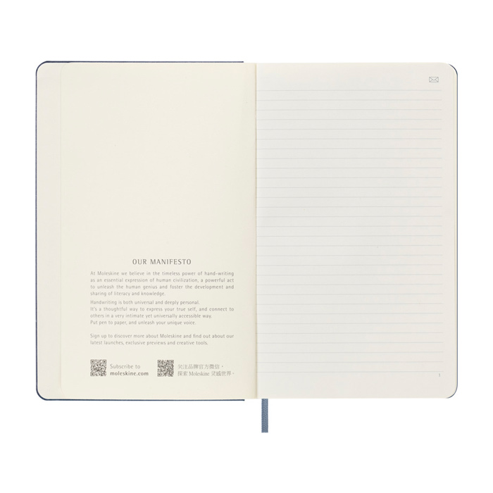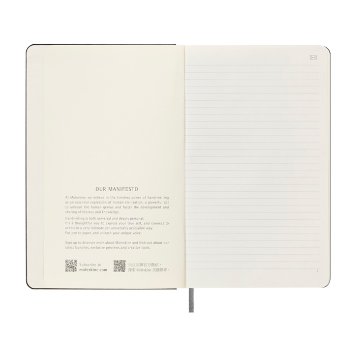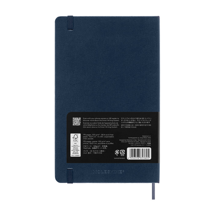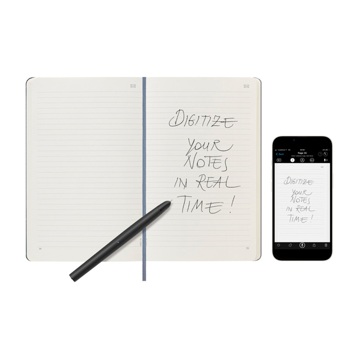 O caderno grande e inteligente Moleskine tem uma capa dura de estilo clássico, com cantos arredondados e papel cor de marfim. Cada página contém Ncodes invisíveis, com os quais a caneta inteligente cria uma cópia digital instantânea de cada palavra e esboço na aplicação Moleskine Notes. O caderno inclui também a história de Moleskine.