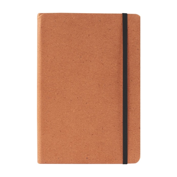 Bloco de notas A5 de capa dura feita de couro reciclado, com 80 folhas de cor creme pautadas no interior. Vem com marca-página e fecho de fita elástica.