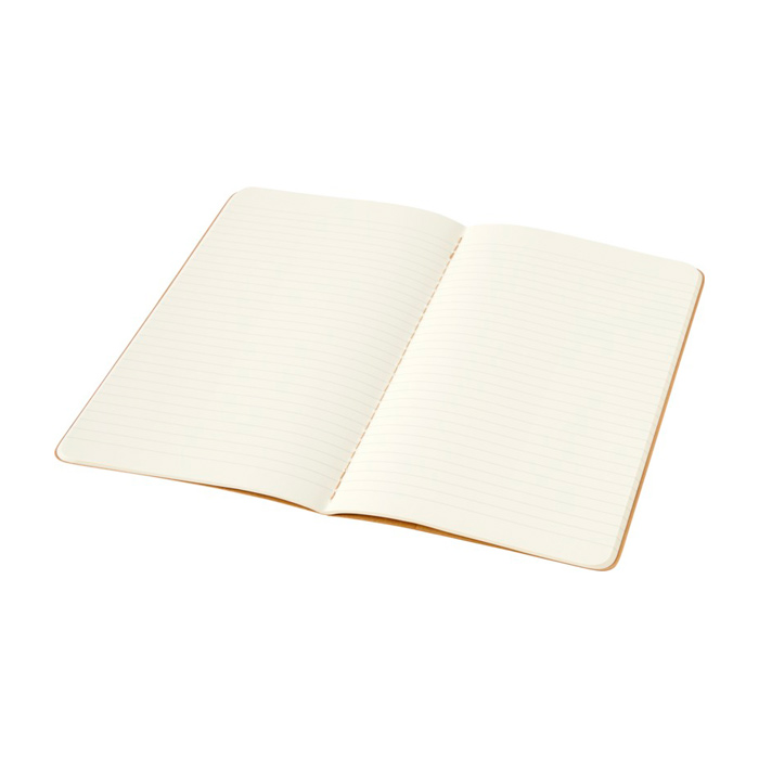 Caderno em cartão com cantos arredondados, pensado para um uso constante no escritório, em visitas e reuniões. A lombada inclui costuras visíveis que ajudam a manter uma abertura confortável ao escrever. Inclui bolso interior para guardar cartões ou notas soltas e páginas pautadas em papel cor marfim de 70 g/m² para uma leitura mais agradável. As últimas 16 folhas são destacáveis, úteis para arrancar lembretes sem afetar o resto. Opção prática para ações de branding e eventos empresariais.