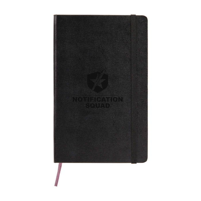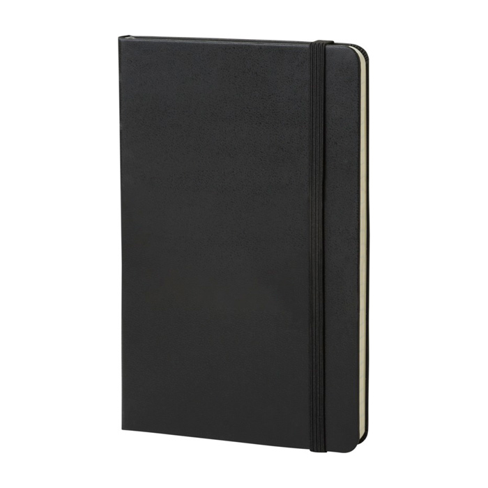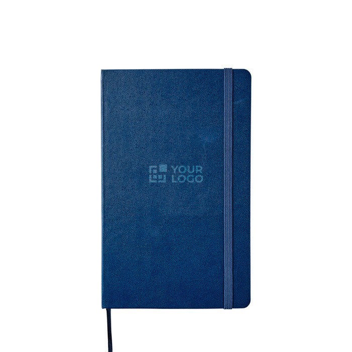 Caderno de capa dura em cartão encadernado, formato grande e cantos arredondados, concebido para uso diário no escritório ou em viagem. Inclui 240 páginas lisas em papel marfim sem ácido, com marcador de fita para localizar as suas anotações rapidamente. O elástico de fecho mantém o conteúdo protegido e o aviso Em caso de perda ajuda a identificá-lo. Acrescenta um bolso interior expansível para guardar notas soltas, cartões ou documentos. Opção prática para eventos, onboarding ou ações de marca com logótipo.