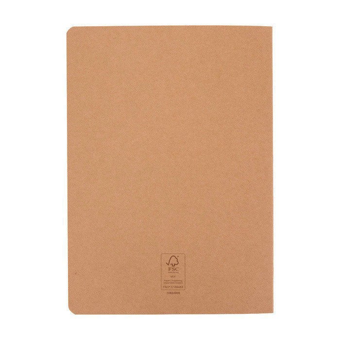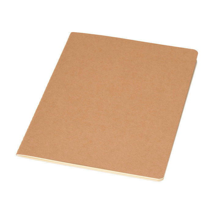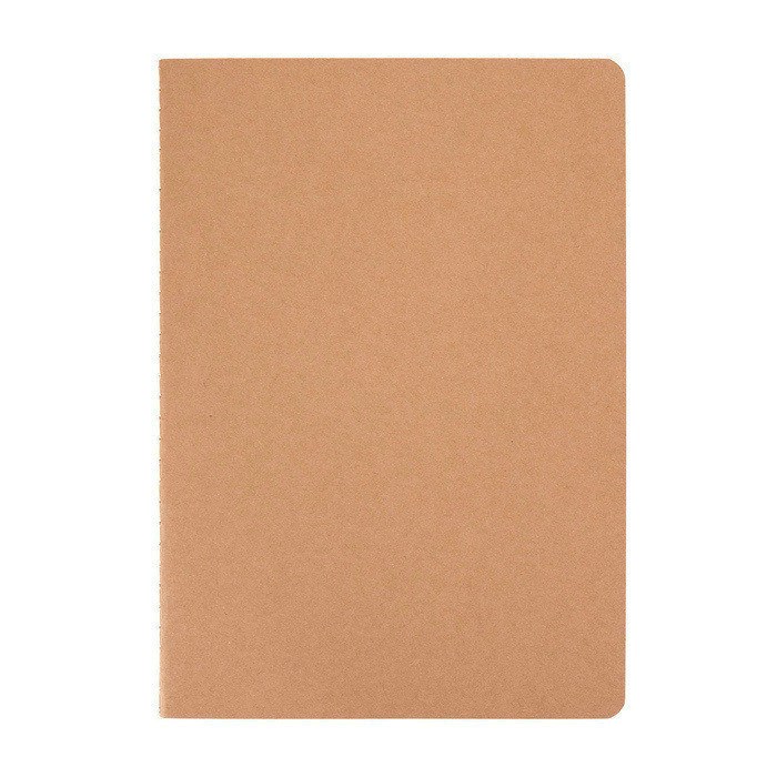 Caderno de papel kraft com lombada cosida visível, folhas A5 pautadas