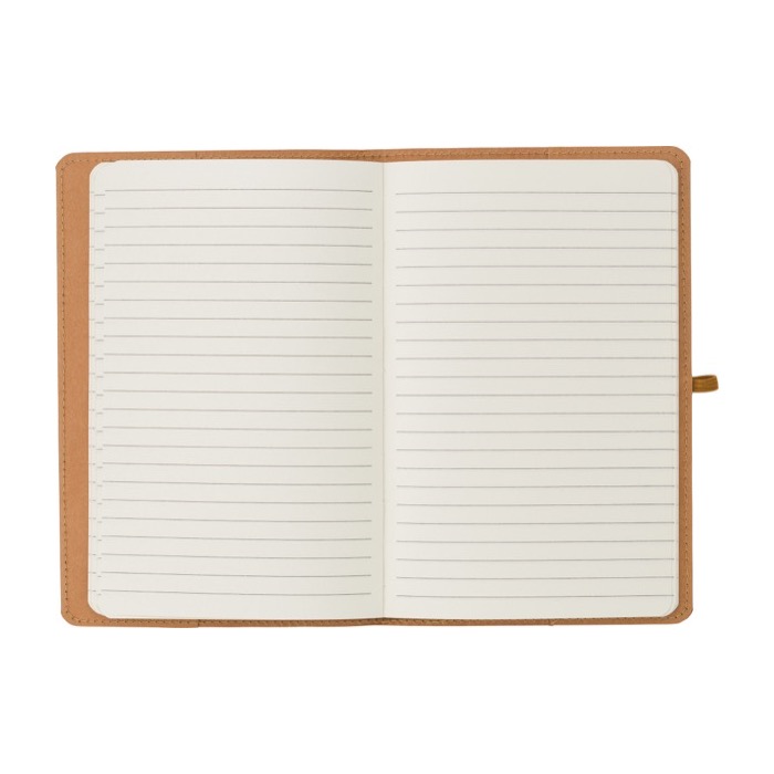 Caderno personalizado A5 (aprox.) com papel kraft e uma capa de tom natural, a qual pode levar o seu logo impresso a cores para publicitar a sua empresa.