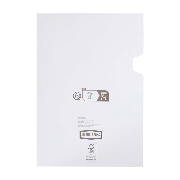 Caderno A5 feito de plástico reciclado tipo papel, com 192 folhas de papel creme de 80 g/m² em formato de agenda diária, ideal para planear e escrever durante o ano todo. Inclui 2 fitas elásticas, 3 marca-páginas de fita preta, vermelha e azul, 200 notas adesivas coloridas (40 por cor) e 1 bolso de papel para guardar notas soltas. O logótipo estampado Journal Books aparece na contracapa e é entregue numa bolsa de papel branco.