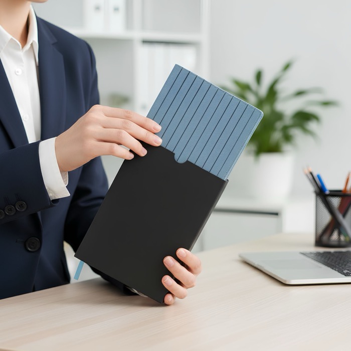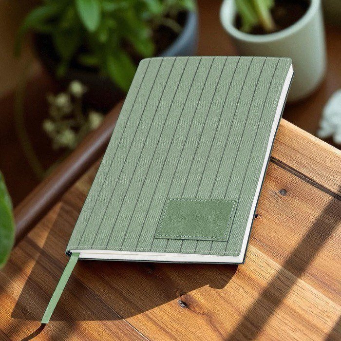 Anota as suas melhores ideias enquanto o logo prende olhares com este caderno de capa texturizado e personalizável. Com versões em cores vivas e folhas lisas.