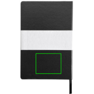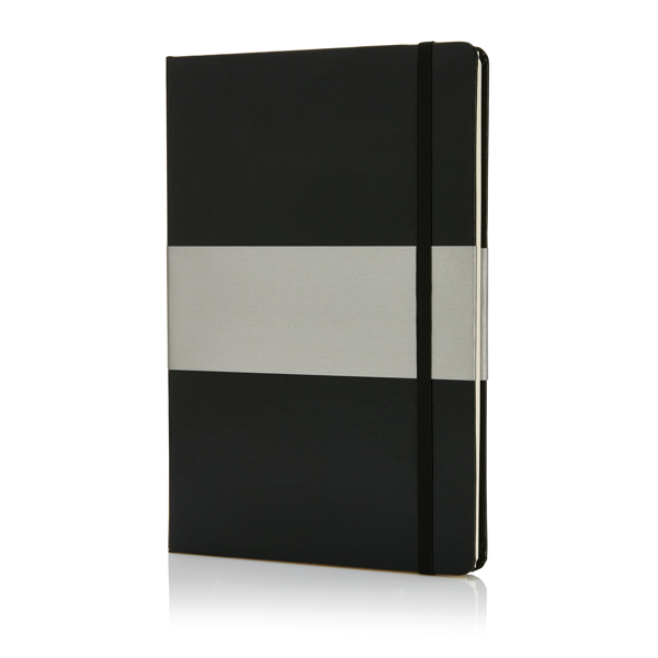 Caderno em formato A5 com um design cuidado. A capa inclui detalhes de papel artístico, com cantos arredondados que proporcionam um acabamento mais polido. O fecho com fita elástica mantém o conteúdo protegido e organizado. O interior conta com 160 páginas pautadas a preto em papel de 80 g/m², proporcionando uma escrita clara e profissional. Incorpora um marca-página que facilita a organização das notas. Uma opção vistosa para empresas que procuram artigos úteis e marcantes para reuniões, feiras ou como reclame da marca em ações promocionais.