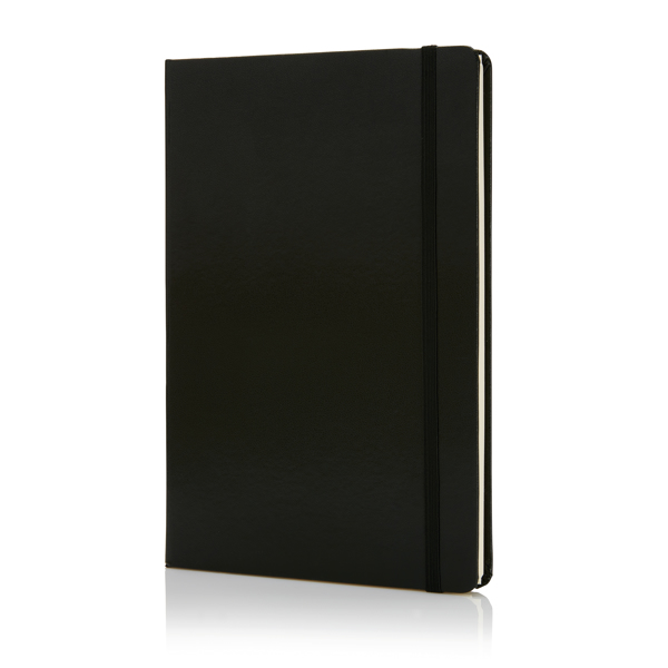 Caderno em formato A5 com apresentação cuidada que combina praticidade e estética. A capa inclui detalhes de papel artístico, com cantos arredondados que proporcionam um acabamento mais polido. O fecho com fita elástica mantém o conteúdo protegido e organizado. O interior conta com 160 páginas pautadas a preto em papel de 80 g/m², proporcionando uma escrita clara e profissional. Incorpora um marca-página preto que facilita a organização das notas. Uma opção vistosa para empresas que procuram artigos úteis e marcantes para reuniões, feiras ou como reclame da marca em ações promocionais.
