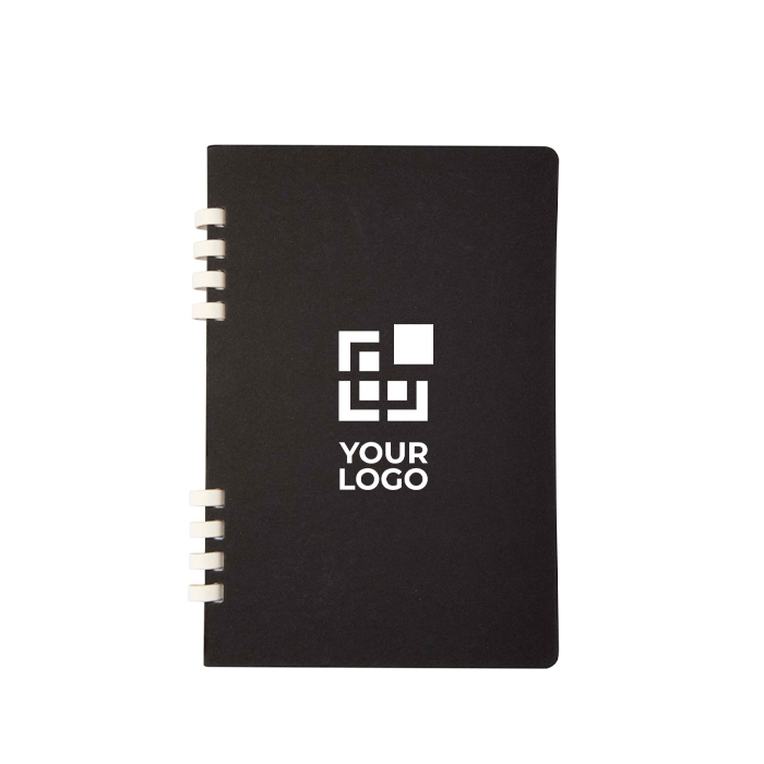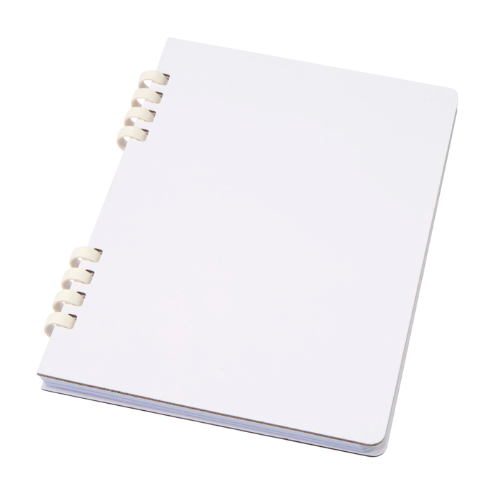 Caderno A5 de capa dura com encadernação de argola e 60 folhas pautadas para tomar notas ordenadamente. O interior é feito de papel reciclado de 70 g/m2 com certificação RCS (Recycled Claim Standard), pensado para uso diário no escritório, reuniões ou formação. A capa dura permite escrever com mais conforto quando não há mesa disponível e as argolas possibilitam a abertura completa e o virar de páginas rapidamente. Opção útil para ações de boas-vindas, eventos e material corporativo com logo.