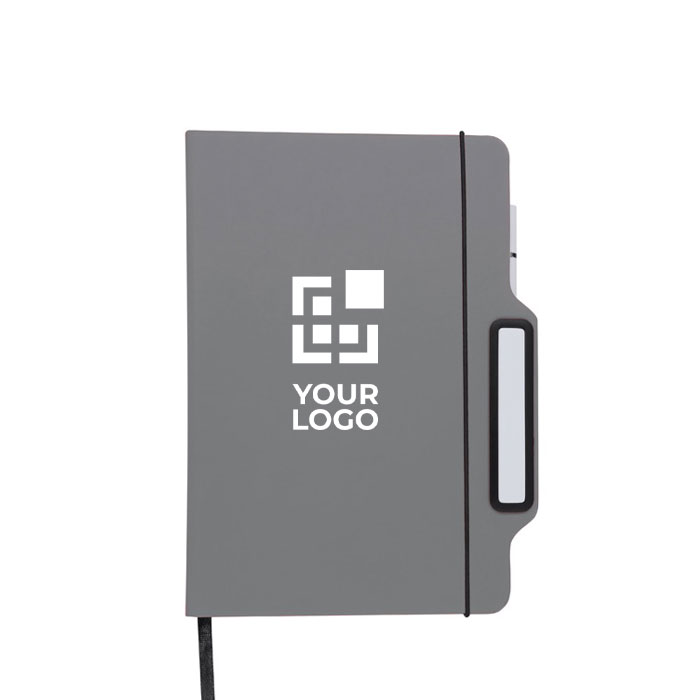 Cadernos publicitários com suporte para smartphone, feitos de PU. Fecho elástico e caneta de escrita eterna. Sobressaia na sua próxima feira.