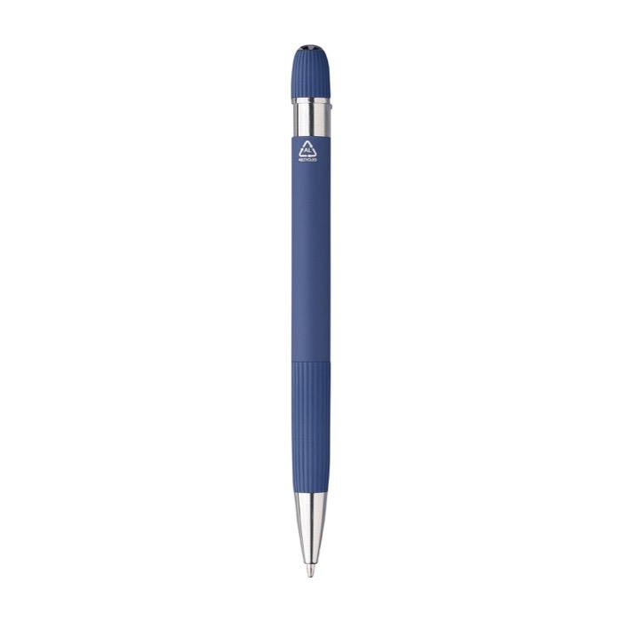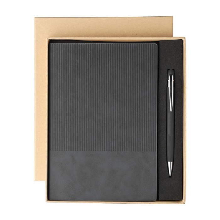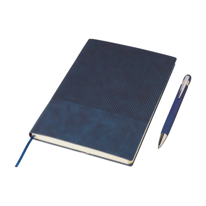 Conjunto de bloco de notas (A5) e esferográfica em PU reciclado composto por um bloco de notas com 100 folhas pautadas em papel de 80 g/m² e uma esferográfica em alumínio reciclado com acabamento de borracha. O bloco de notas tem um marcador de fita e uma capa com aspeto de veludo cotelê na parte superior da frente e no verso, com um logótipo reciclado em relevo no verso. A esferográfica inclui uma pega às riscas e detalhes na parte superior, uma ponta de plástico cromado, um botão de pressão, um clipe de metal e um logótipo reciclado gravado a laser. Embalada numa caixa de cartão castanha resistente com revestimento em EVA para a esferográfica. Tinta azul.