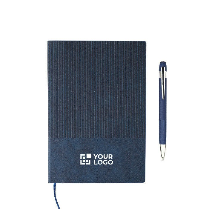 Caderno A5 com efeito de camurça na parte superior e caneta tinta azul