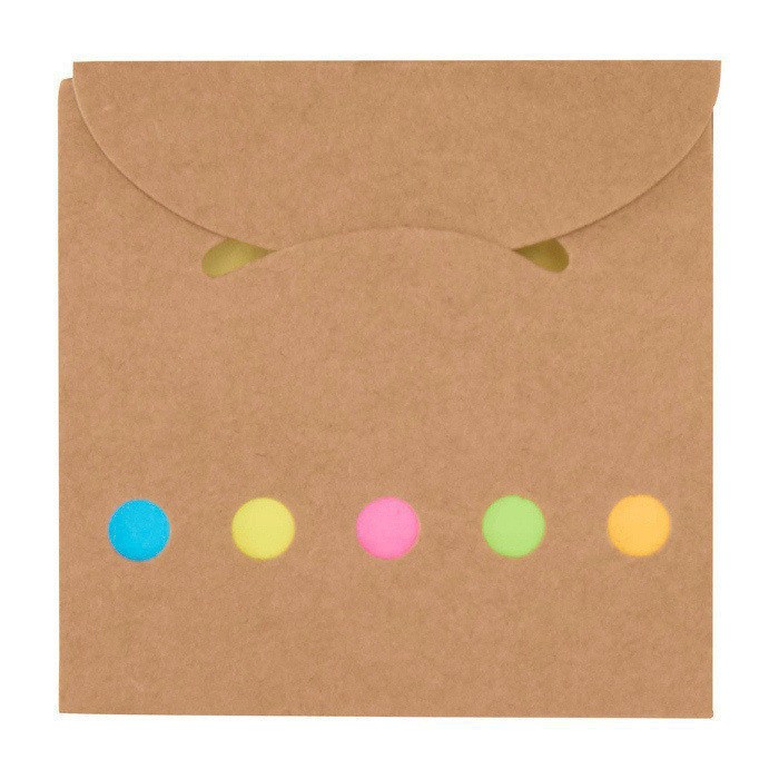 Caderno com 125 notas adesivas pequenas (5 × 1,5 cm) em 5 cores diferentes e 25 notas adesivas grandes (7,5 × 7,5 cm) em cor amarela.