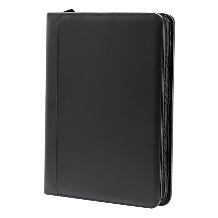 Porta-fólio de pele sintética com fecho de correr e formato A4, desenhado para reuniões, visitas comerciais e uso diário no escritório. Inclui quatro compartimentos interiores para organizar documentos, cartões ou notas, além de porta-caneta para a ter sempre à mão. Contém bloco de 25 páginas em branco para tomar notas ou preparar agendas de trabalho. Escolha prática para ações de RH, eventos corporativos ou entregas a equipas comerciais.