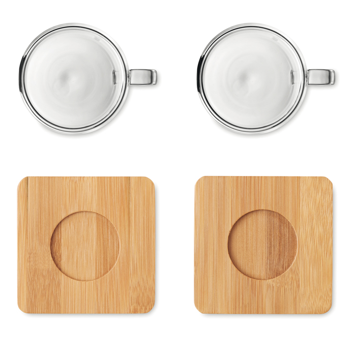 Um conjunto de 2 copos térmicos de parede dupla com base para copos de bambu. Graças ao vidro borossilicato duplo, a temperatura da bebida é mantida durante muito tempo. Capacidade de 100 ml. Tamanho da base para copos: 8 x 8 x 1 cm.
