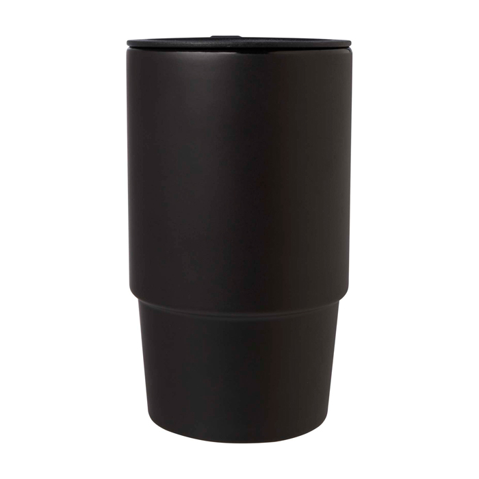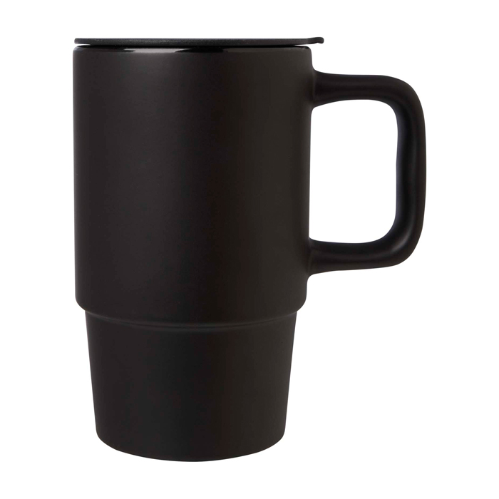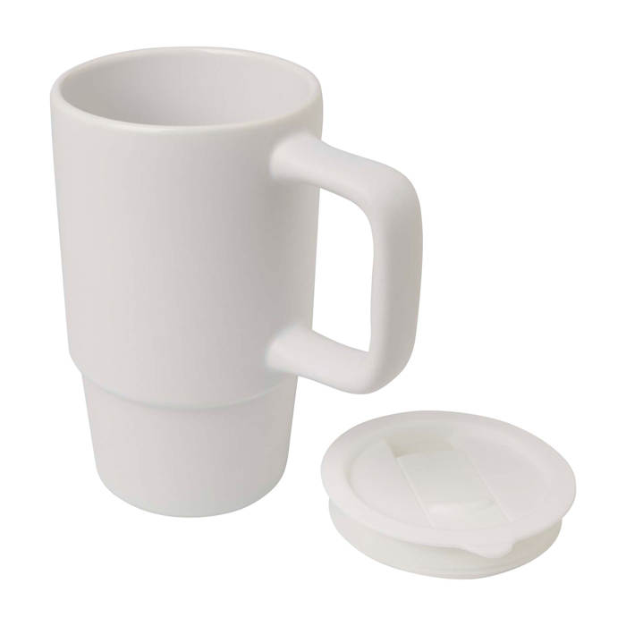 Caneca de cerâmica com asa de grande tamanho e tampa de plástico à prova de derrames, com acabamento exterior mate. Adequada para lava-louça (independentemente do método de impressão) e entregue em caixa de cartão reciclado. Capacidade: 450 ml.