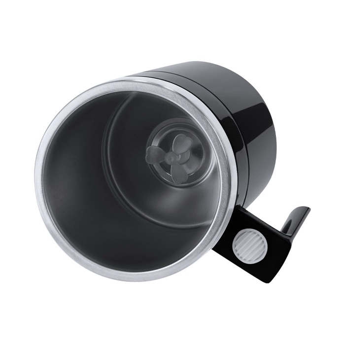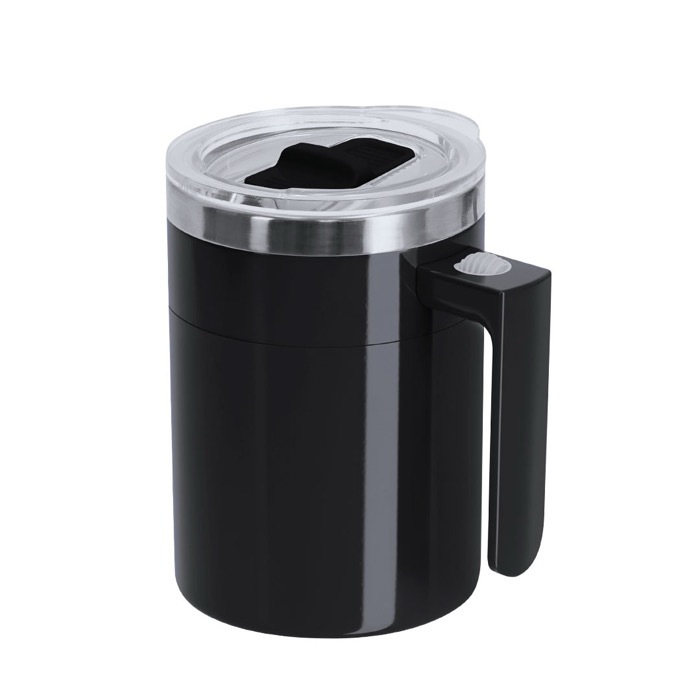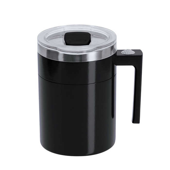 Caneca misturadora de aço inoxidável de 400 ml, pensada para preparar bebidas sem colher e com menos resíduos na mesa. Inclui tampa com bocal deslizante para beber mais confortavelmente durante o dia de trabalho. Contém na base um agitador elétrico e ativa-se via botão ON/OFF situado na asa. Funciona com 2 pilhas pequenas AAA (não incluídas), o que facilita o seu uso no escritório ou em viagem. Escolha prática para ações de RH e brindes empresariais com marcação.