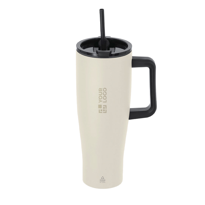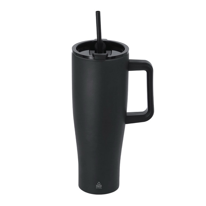 Caneca térmica de aço inoxidável reciclado com capacidade de 1200 ml, desenhada para uso confortável no escritório, eventos e deslocações. Dispõe de sistema de bebida duplo: orifício com fecho hermético para servir controladamente e palhinha para beber diretamente. A asa ergonómica de plástico melhora a preensão e torna-a fácil de levar de um ponto para o outro. Material sem BPA (bisfenol A) e conta com selo de aço inoxidável reciclado. Útil como brinde empresarial para ações de marca em ambientes internos.