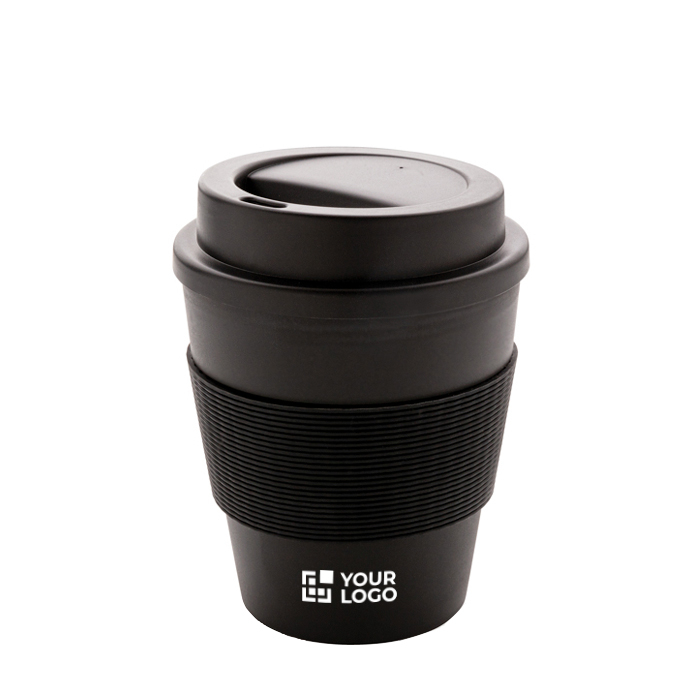 Copo de 350ml, reutilizável, de plástico PP 100% reciclável. Com um design moderno que captará todas as atenções, disponível em várias cores elegantes que combinarão na perfeição com o seu logótipo. Tem uma tampa de rosca antigota e uma capa de silicone. Seguro para bebidas a 100 graus Celsius. Adequado para máquina de lavar louça e micro-ondas. Sem dúvida, um dos copos take away mais completos da nossa coleção, tanto pela sua estética como pela sua praticidade. Pode aguentar o calor cerca de 2 horas e o frio cerca de 4 horas, suficiente para trajetos curtos. É fornecida em saco e a granel.