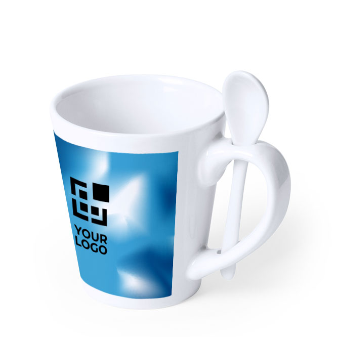 Caneca e colher feita de cerâmica e com capacidade para 300 ml. Este modelo em específico distingue-se, sobretudo, por permitir marcação via sublimação, pelo que se poderá colocar o logótipo ou design pretendido na superfície. Estas canecas sublimadas apenas estão disponíveis em cor branca, deixando que a personalização seja o elemento mais chamativo. Além disso, foram concebidas para lavagem na máquina de lavar loiça. A impressão da imagem ocupa quase todo o exterior do recipiente, não sendo apenas um mero detalhe, mas sim um acabamento estético vistoso.