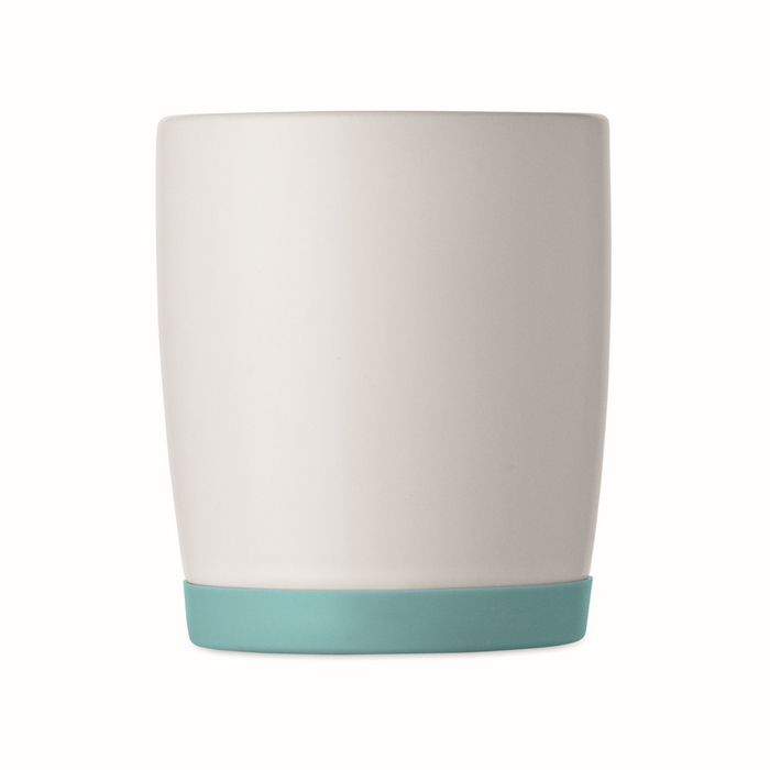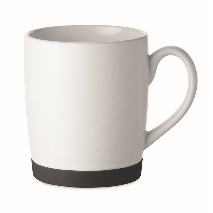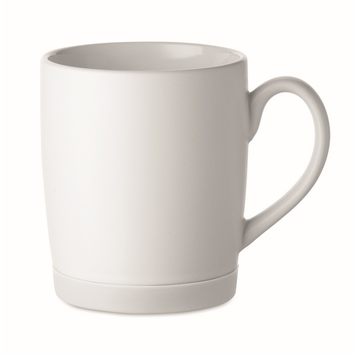 Caneca de cerâmica com acabamento branco mate e base de silicone, desenhada para uso confortável no escritório e salas de reuniões. A capacidade de 300 ml é excelente para café, chá ou infusões durante o dia de trabalho. A base confere estabilidade na mesa e ajuda a evitar deslizamentos em superfícies lisas. Inclui embalagem individual de caixa de cartão branco, adequada para armazenamento e entrega em eventos. Opção prática para kits de boas-vindas, ações internas ou brindes empresariais.