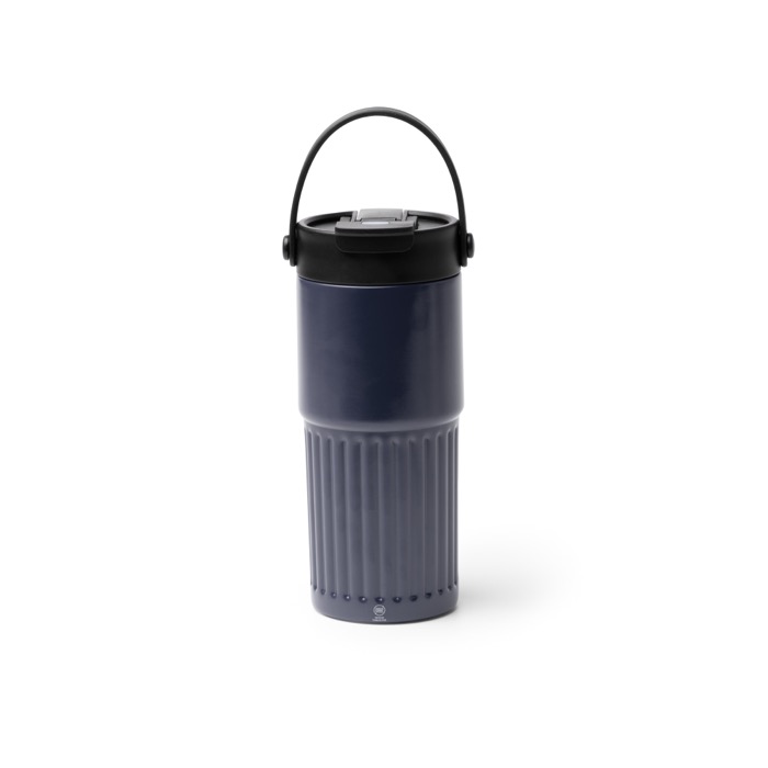 Copo térmico em aço inoxidável 304 reciclado, de parede dupla e com capacidade de 600 ml, concebido para um uso diário confortável no escritório ou em deslocações. Incorpora tampa dupla: de um lado, palhinha com fecho independente e, do outro, doseador para beber diretamente. O design combina base chanfrada e parte superior lisa, oferecendo boa pega e uma presença sóbria. Inclui ainda pega de transporte rebatível e base antiderrapante para maior estabilidade. Adequado para ações de merchandising empresarial e eventos internos.