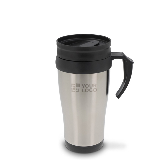 Copo térmico personalizado com asa. Tem o exterior em aço e o interior em plástico. Apresentado numa caixa de presente. Ofereça-o no verão ou no inverno!
