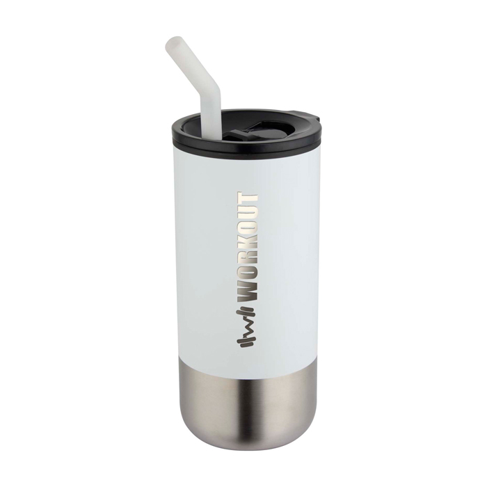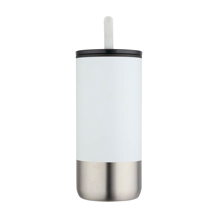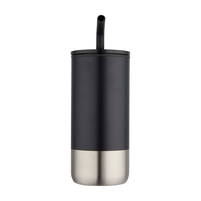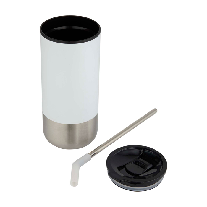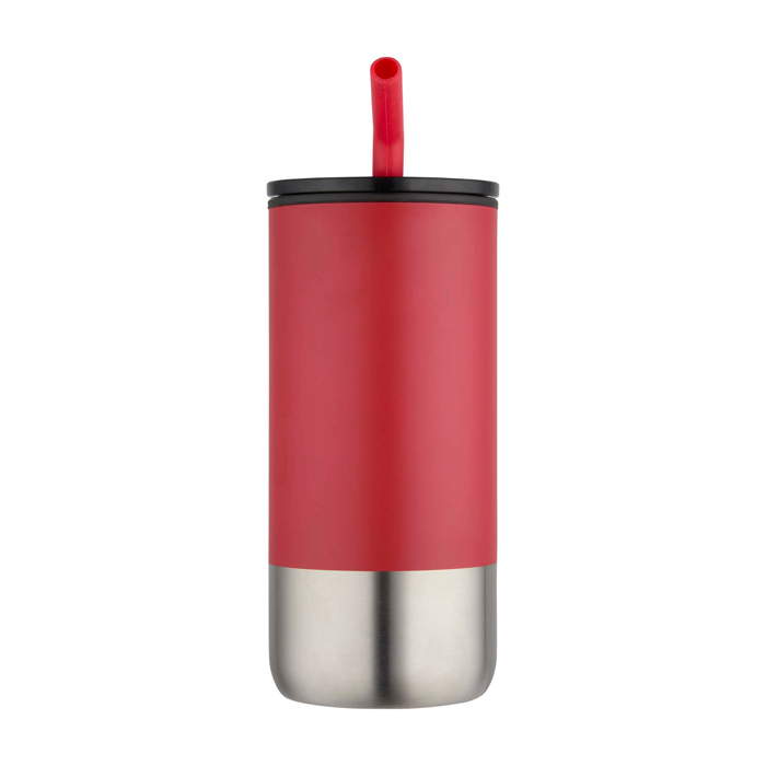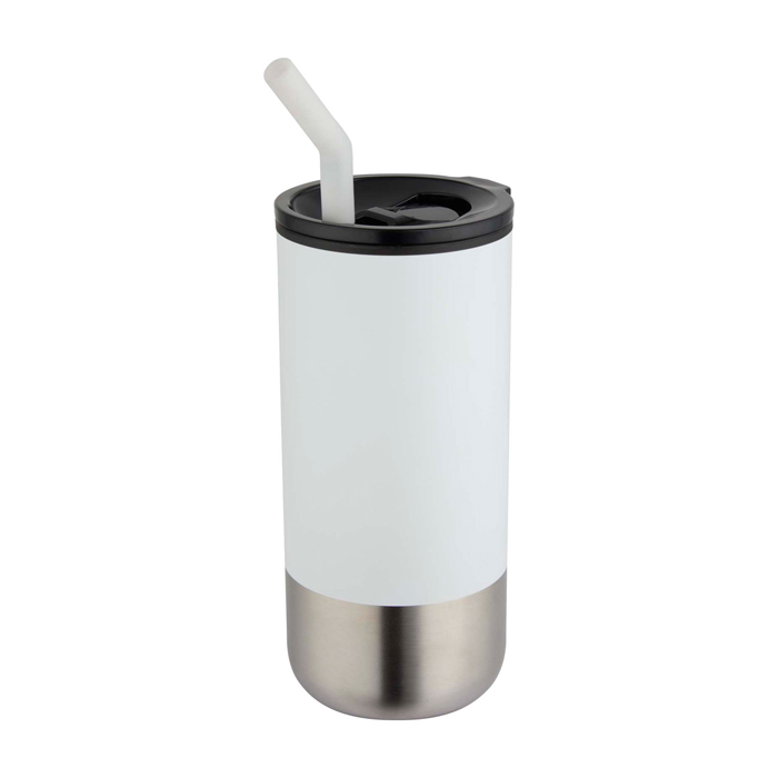 Copo de parede dupla com interior de plástico e exterior de aço inoxidável reciclado com certificação RCS (Recycled Claim Standard). Inclui palhinha de aço inoxidável reciclado com ponta de silicone para beber com mais conforto. A tampa deslizante combina plástico e dispõe de fecho prático para o quotidiano. O acabamento mate ajuda na preensão segura e presença uniforme na mesa ou secretária. Com capacidade de 480 ml, encaixa em ações de boas-vindas, cafetarias corporativas ou eventos com branding.