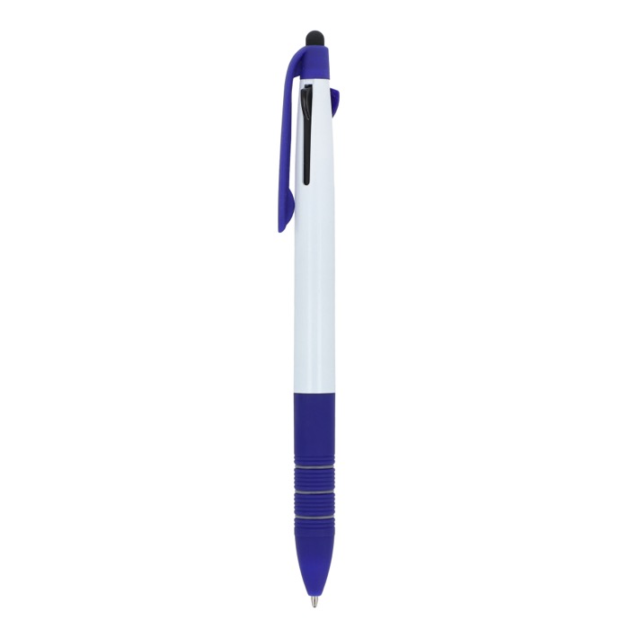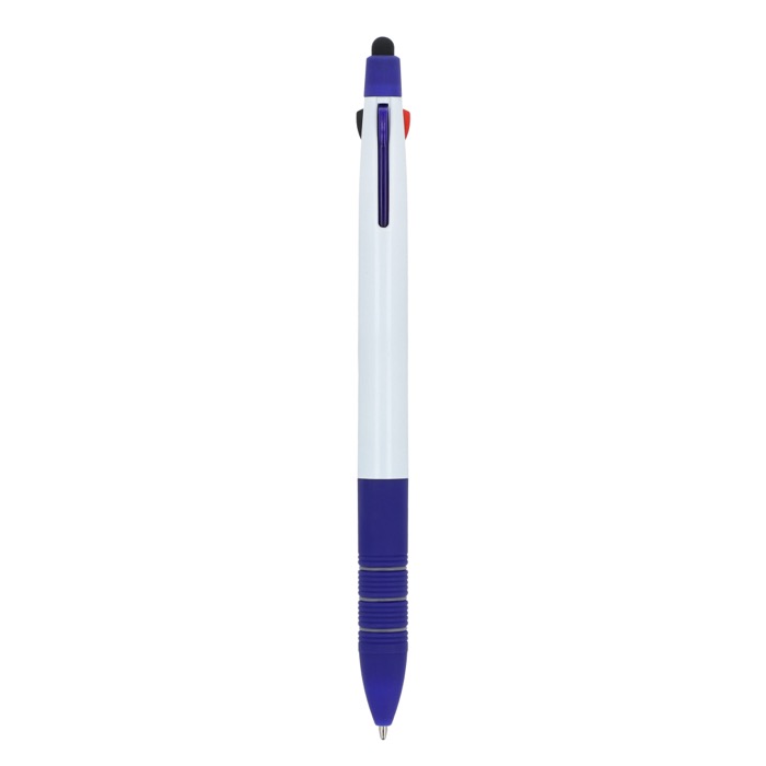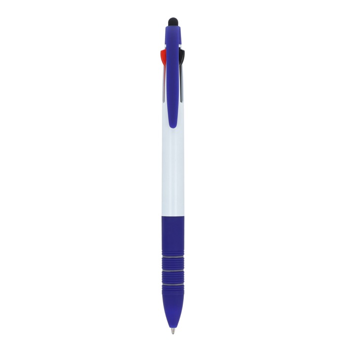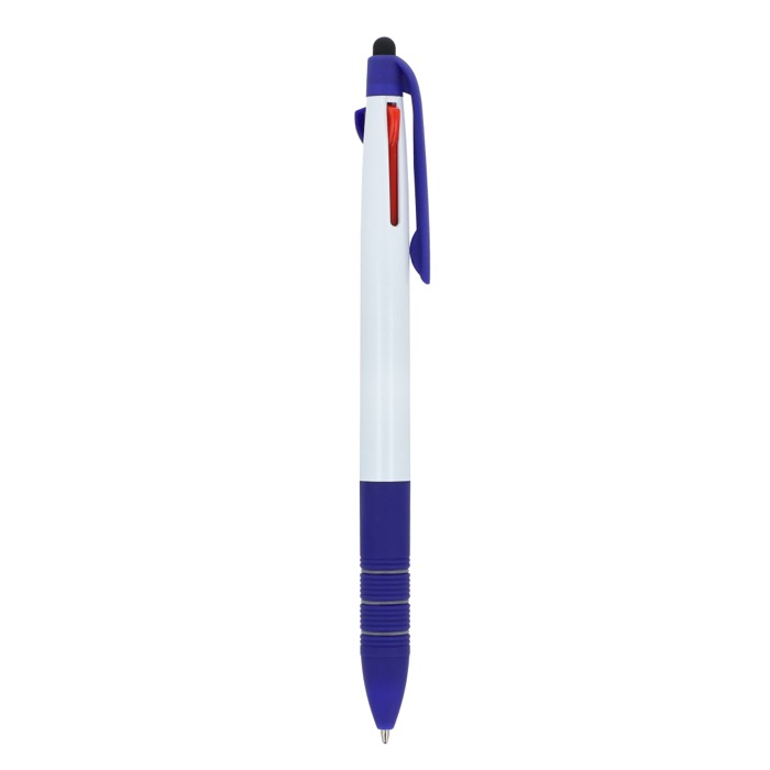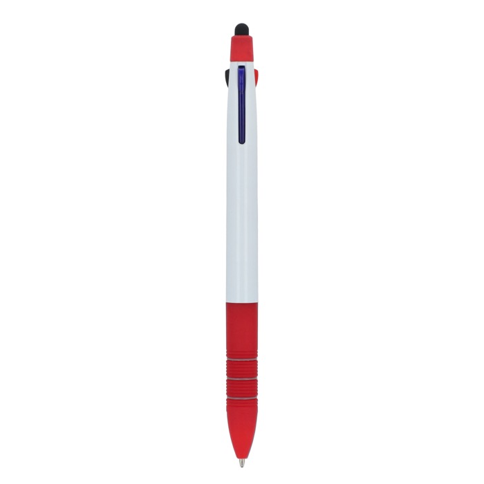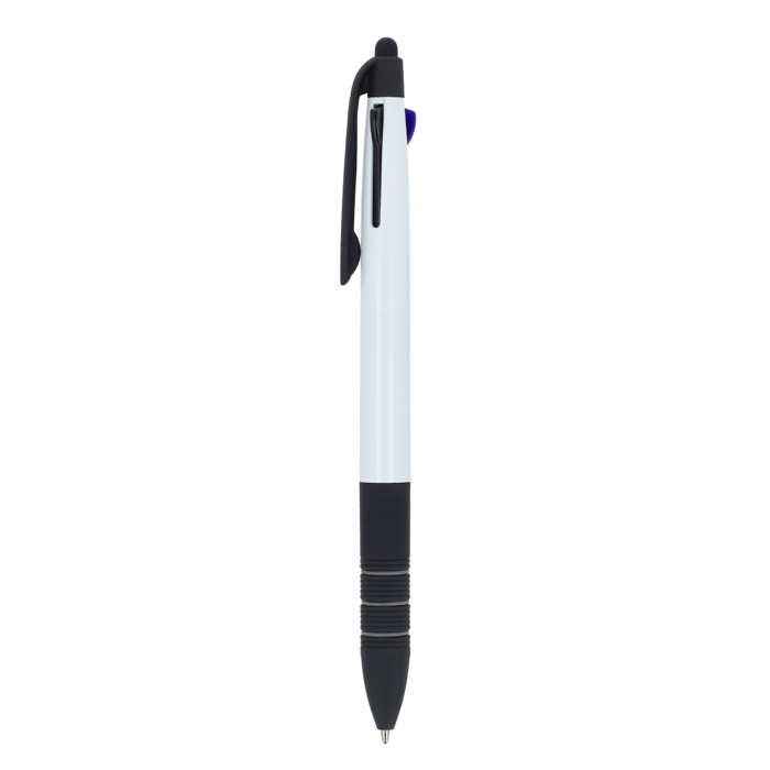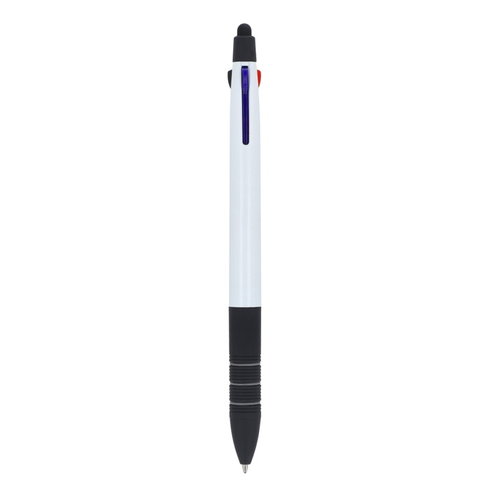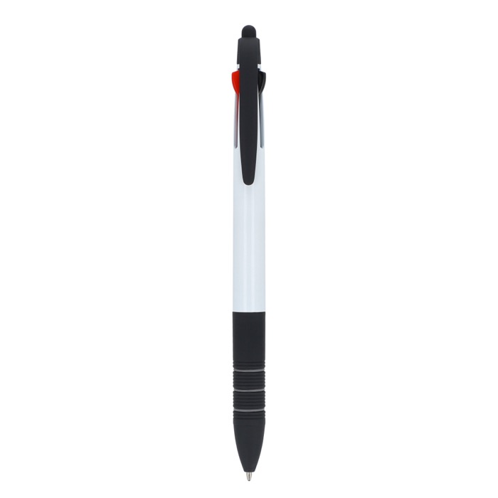 Caneta de plástico com três cores de escrita e ponteira táctil, projetada para uso diário no escritório. Dispõe de pega macia e ergonómica que melhora a preensão em reuniões longas ou tarefas de atenção ao cliente. Permite alternar entre tinta preta, azul e vermelha num só corpo, o que agiliza correções, revisões e anotações. A ponteira serve para interagir com ecrãs sem os manchar. Opção prática para ações de visibilidade de marca em feiras, formações ou receções.