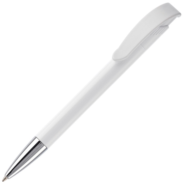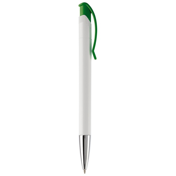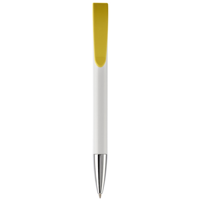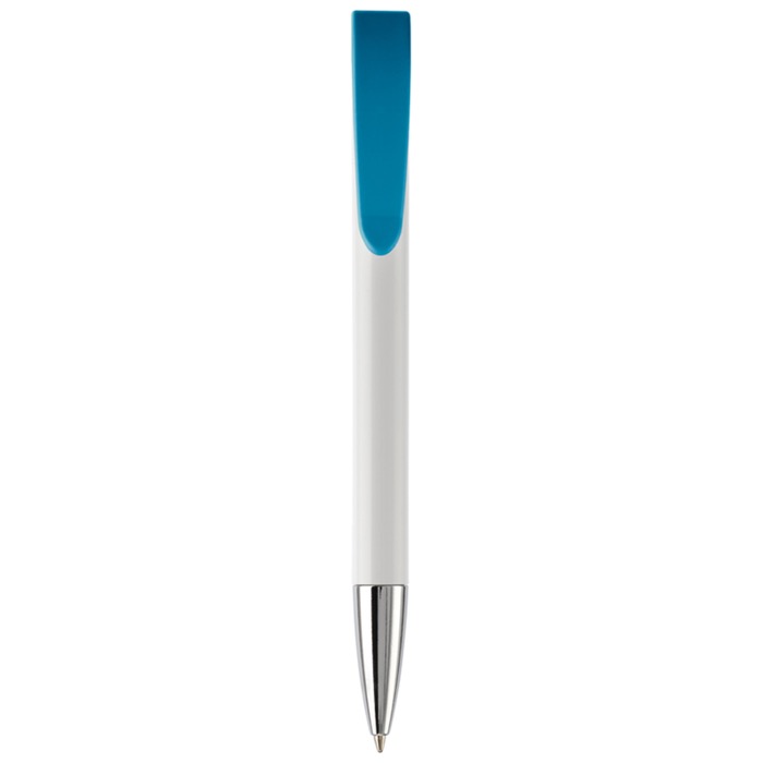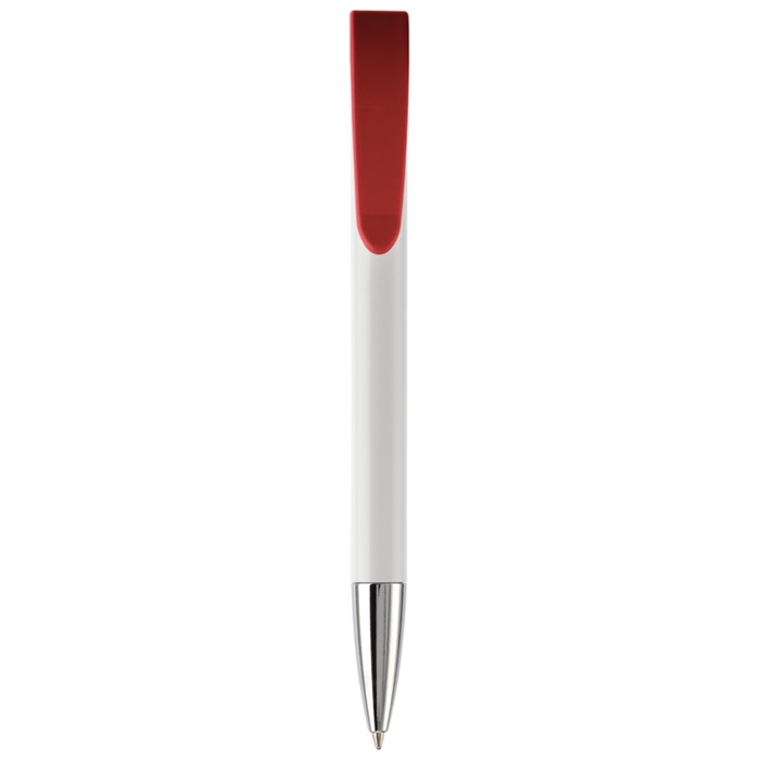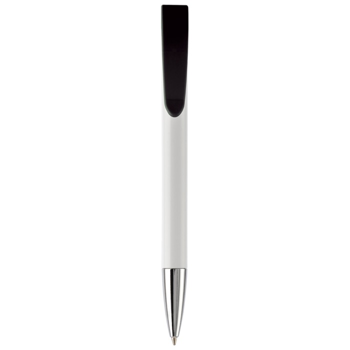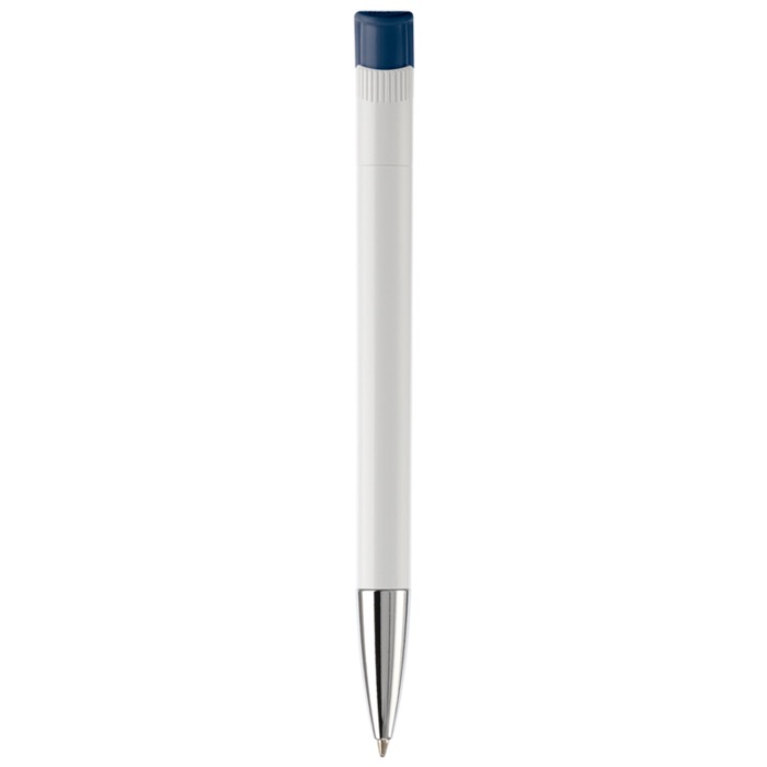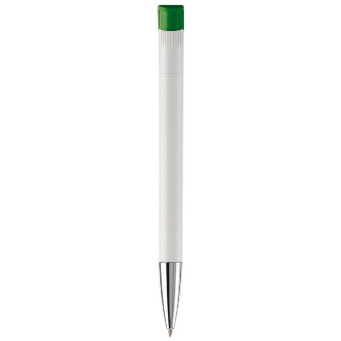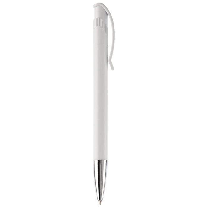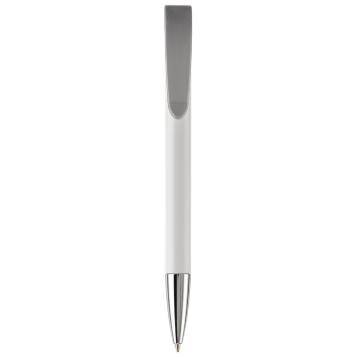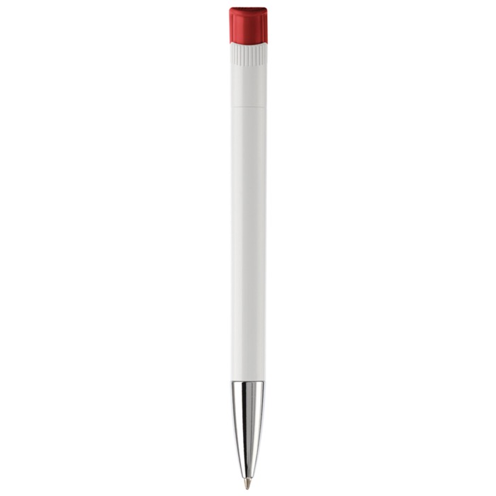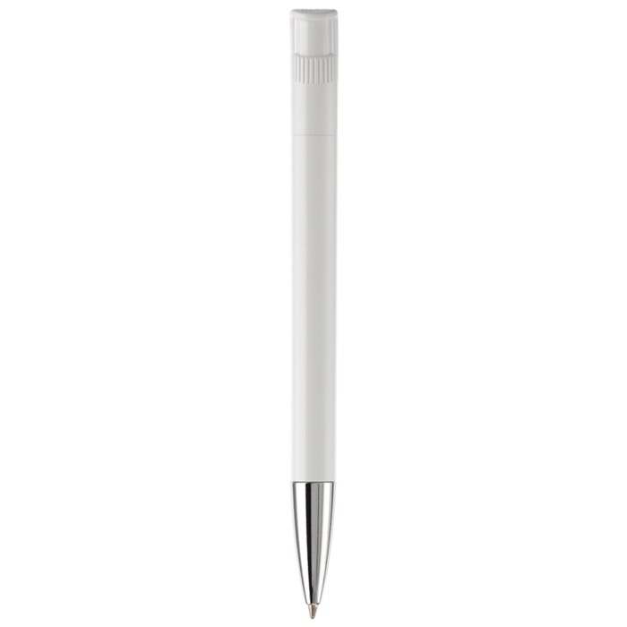 Caneta de plástico de cor branca com detalhes no botão