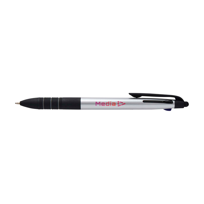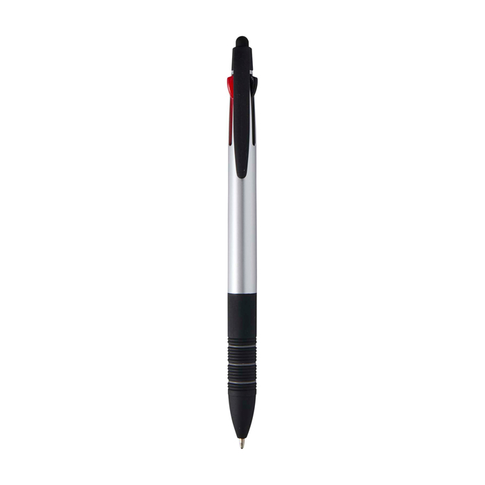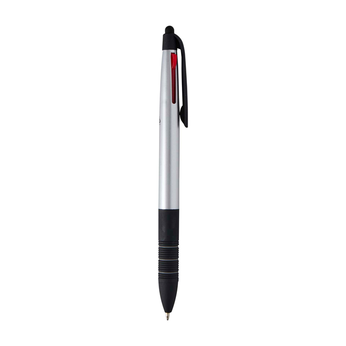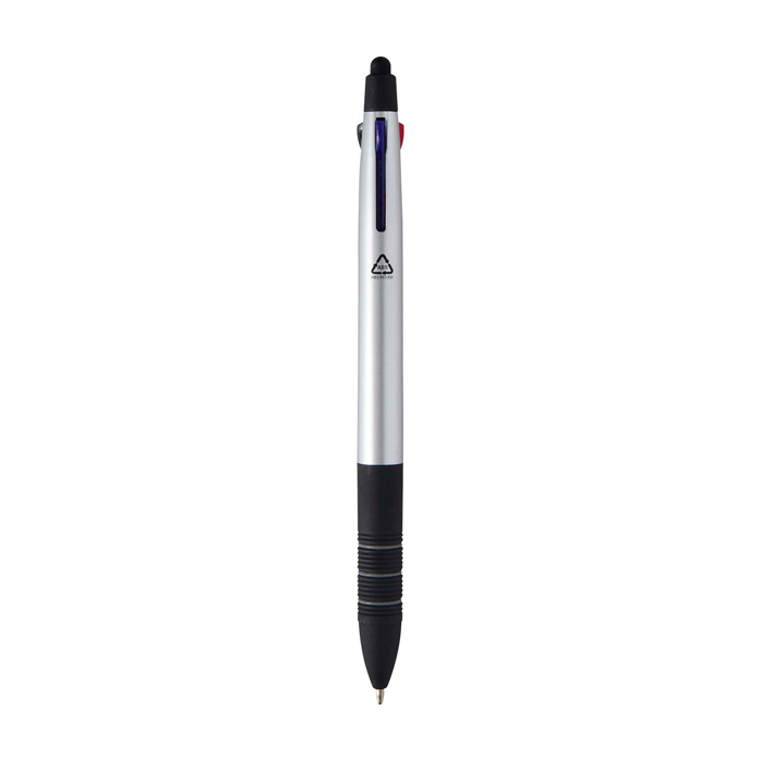 Caneta 3 em 1 de plástico com certificação RCS (Recycled Claim Standard) e acabamento metálico, desenhada para alternar entre escrita e uso em ecrã. Inclui ponteira stylus para ecrãs tácteis e mecanismo deslizante que permite trocar rapidamente entre tinta preta, azul e vermelha. A pega ergonómica de borracha preta antideslizante e argolas cinzentas melhora a preensão no uso diário. Recomendável para ações de marca em feiras, formações e espaços no escritório.