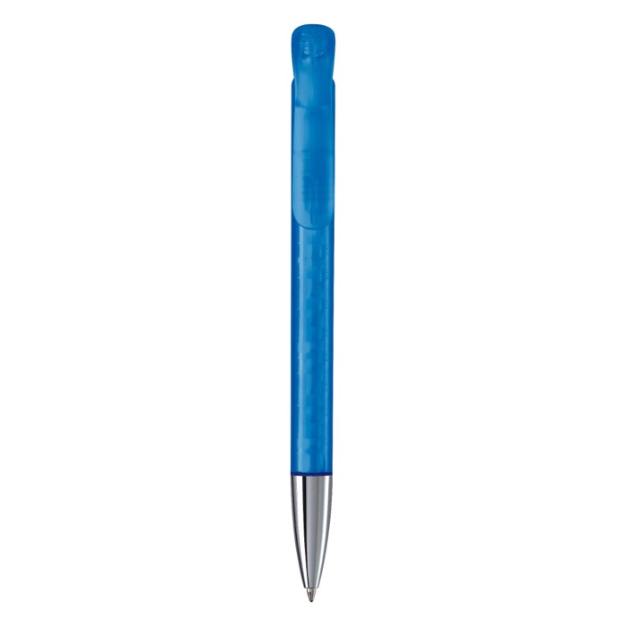 Caneta de plástico transparente com ponta metálica, fabricada na Alemanha. Esta caneta tem uma recarga Jumbo de tinta azul e é transparente com uma ponta metálica.