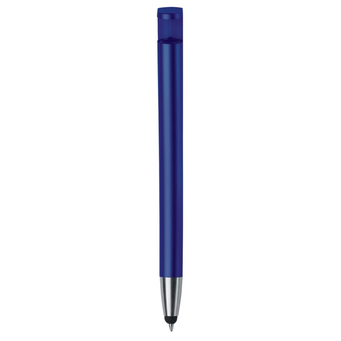 Caneta de plástico com ponteira e suporte para telemóvel, tinta azul