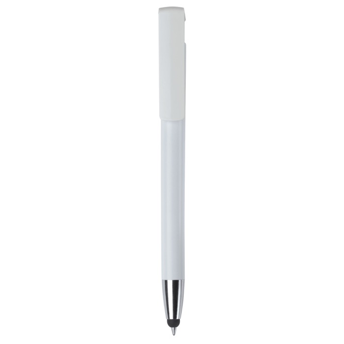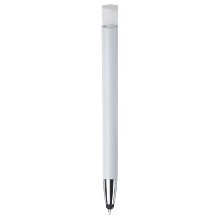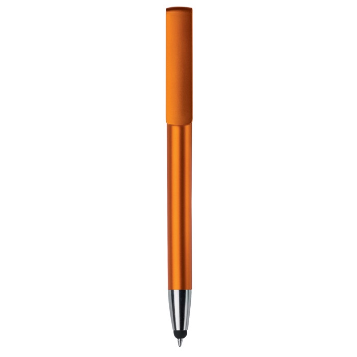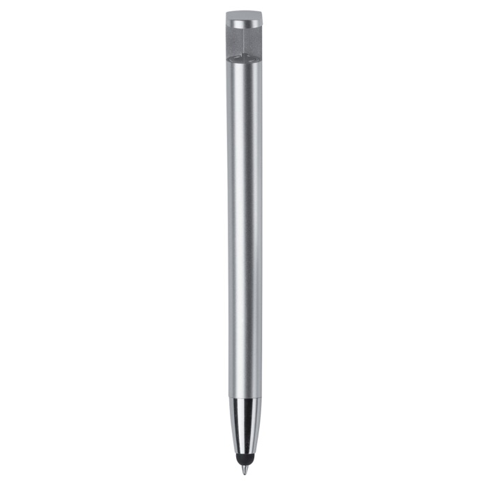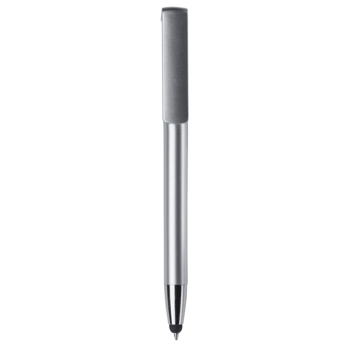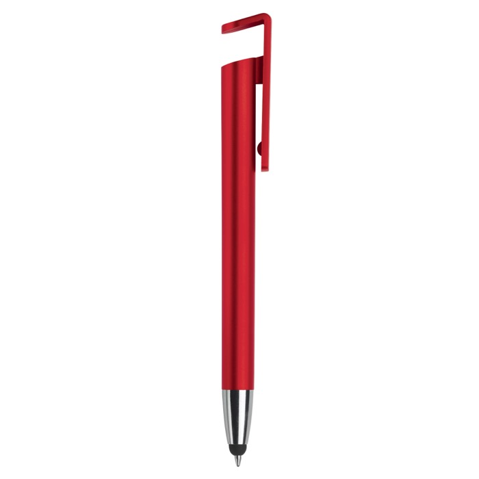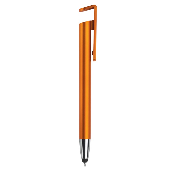 Tudo em um: caneta corporativa, ponteira táctil e suporte para o telemóvel. Este inovador design melhora a funcionalidade, mantendo um estilo profissional.