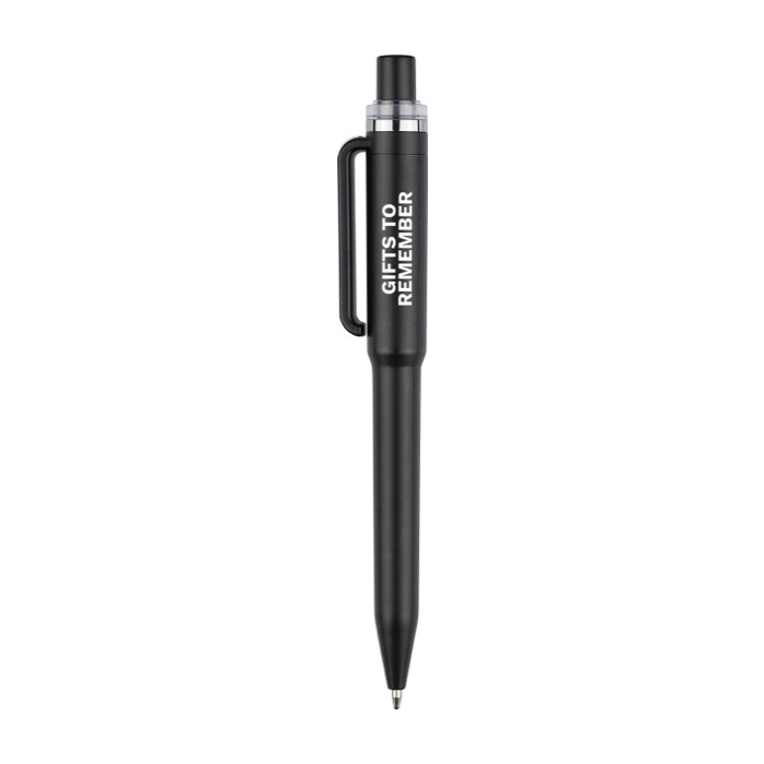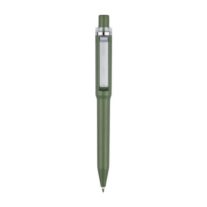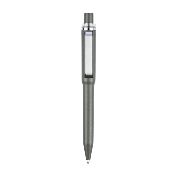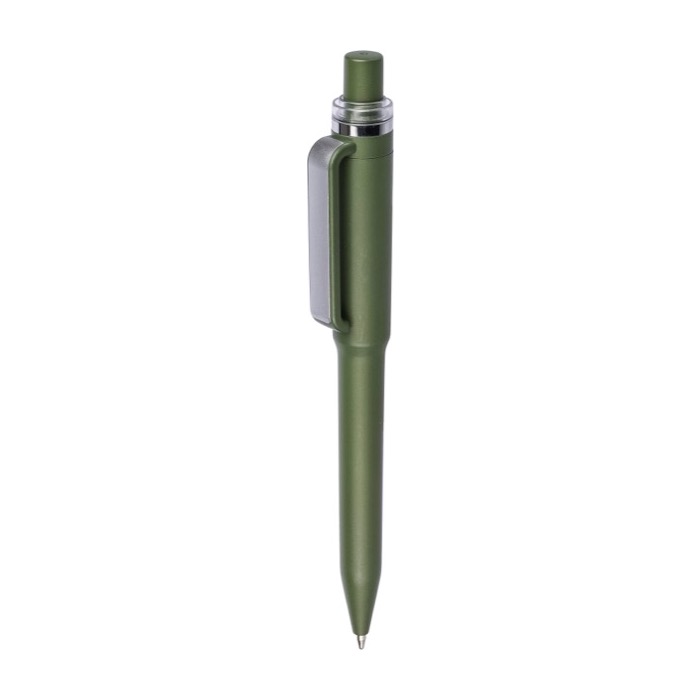 Esferográfica em ABS reciclado com a forma de uma caneca de viagem, com um acabamento metálico. Inclui uma recarga azul com um comprimento de escrita de 800 metros, um mecanismo de pressão, um botão de plástico, um clip e um anel de plástico cromado na parte superior. Inclui um logótipo em ABS reciclado moldado.