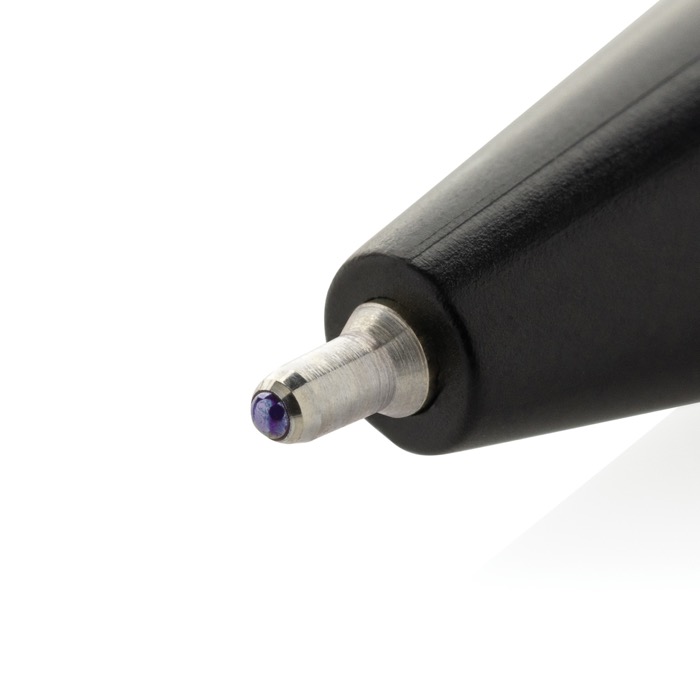 Caneta com certificação GRS R-ABS está fabricada com 55 % de plástico reciclado R-ABS. Incorpora tinta ultradeslizante de baixa viscosidade que oferece uma escrita suave e contínua em cada uso. A tinta é de cor azul e conta com um comprimento de escrita de 800 metros.