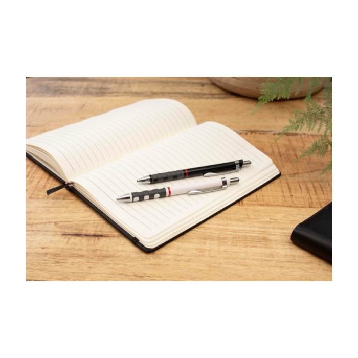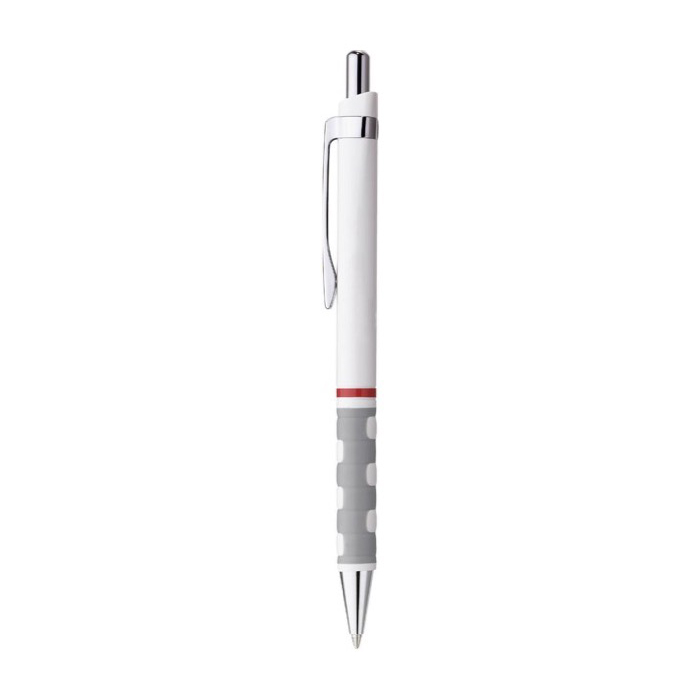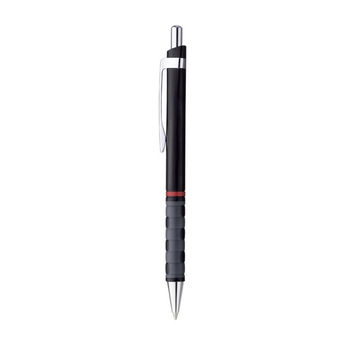 Caneta Rotring de ABS com pega antiderrapante de borracha e tinta azul com recarga jumbo. O detalhe ideal para quem valoriza uma escrita confortável e fluida.