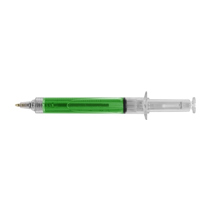 Caneta de AS em forma de seringa. Com líquido colorido no interior: transparente, azul, verde ou vermelho. Tinta preta.