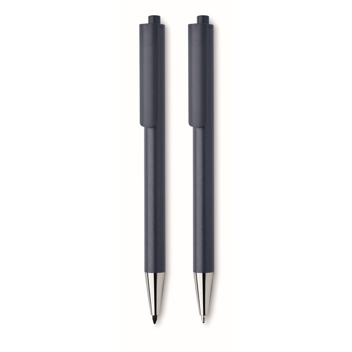 Conjunto de canetas de alumínio reciclado com 1 caneta de botão e 1 caneta de grafite sem tinta. Tinta azul. Apresentado em caixa de papel reciclado.