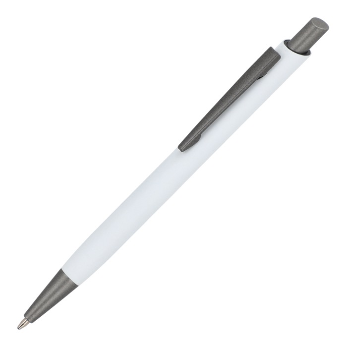 Caneta de alumínio com acabamento macio e clipe metálico para a levar no bolso, agenda ou lanyard sem que se desprenda. Inclui recarga jumbo de escrita azul, concebida para um traço contínuo e confortável no dia a dia. O corpo proporciona uma superfície adequada para personalização com logo em ações de marca. Opção prática para equipar salas de reuniões, receção, feiras e formações ou como brinde empresarial em visitas comerciais.