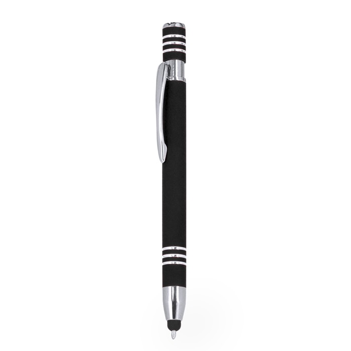 Caneta com ponteira tátil em alumínio com mecanismo de pressão e corpo de borracha. Ideal para gravação a laser, revelando o logótipo em cor prateada.