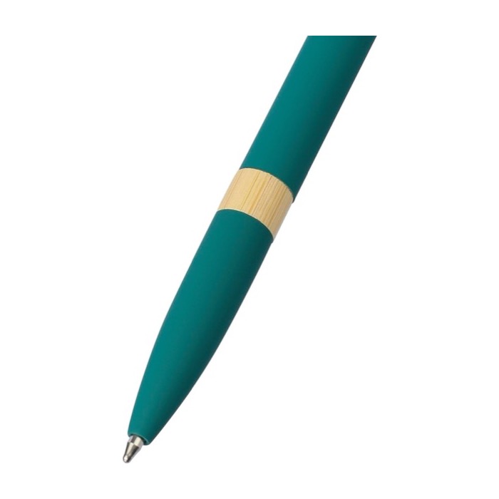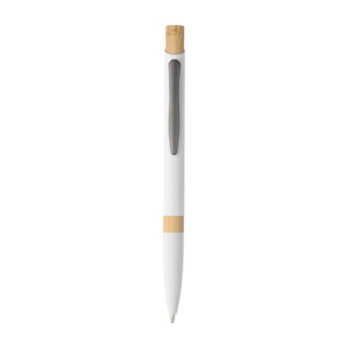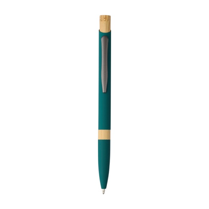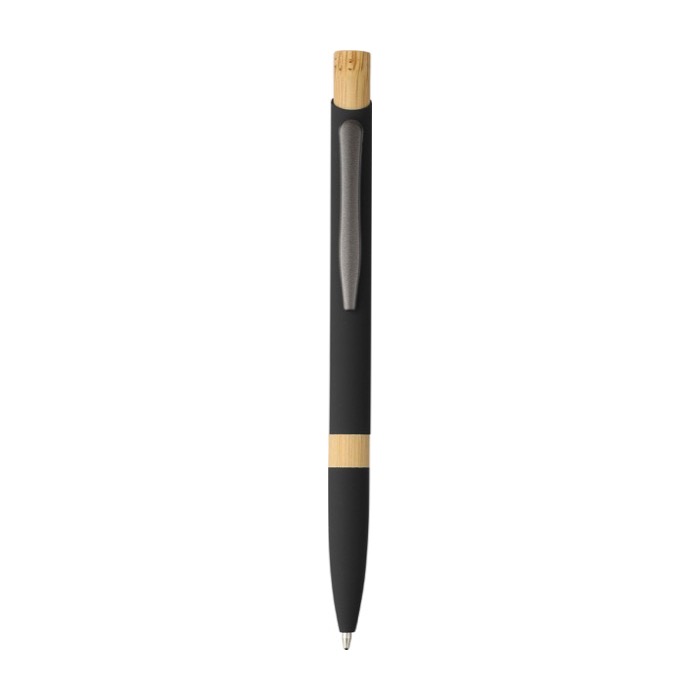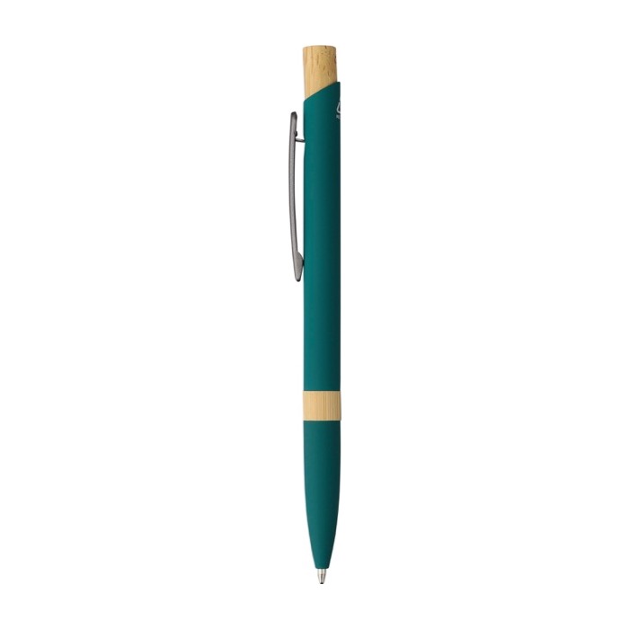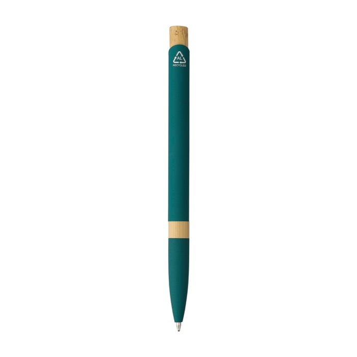 Esferográfica em alumínio reciclado com acabamento em borracha, botão em bambu e anel em bambu no corpo. Possui um mecanismo de pressão, um aparo de 1,0 mm e tinta azul com um comprimento aproximado de escrita de 800 metros. Inclui um logótipo gravado em alumínio reciclado.