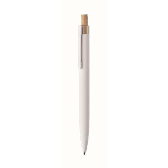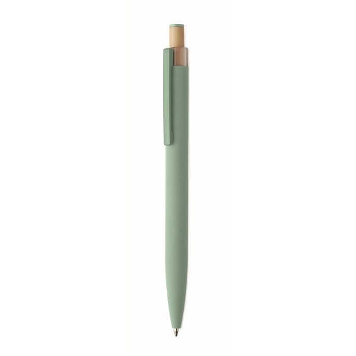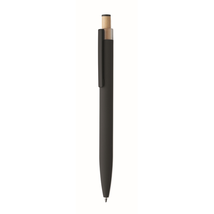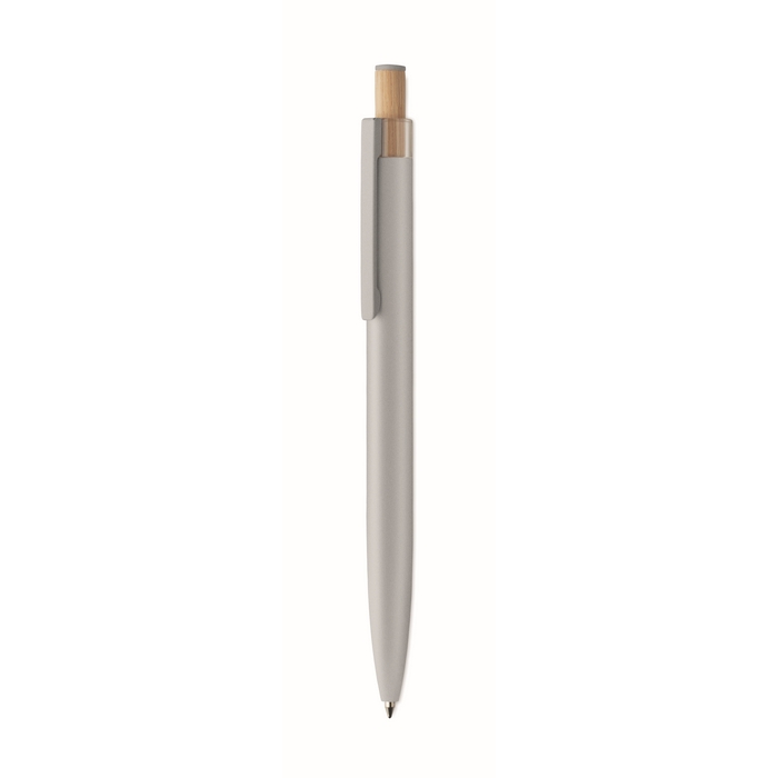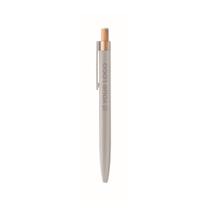Caneta de alumínio reciclado com botão de bambu e clipe metálico, tinta azul. Brinde publicitário que realça a visibilidade da marca em reuniões e escritórios.