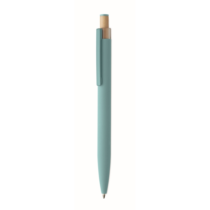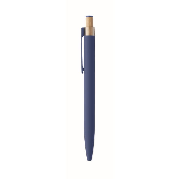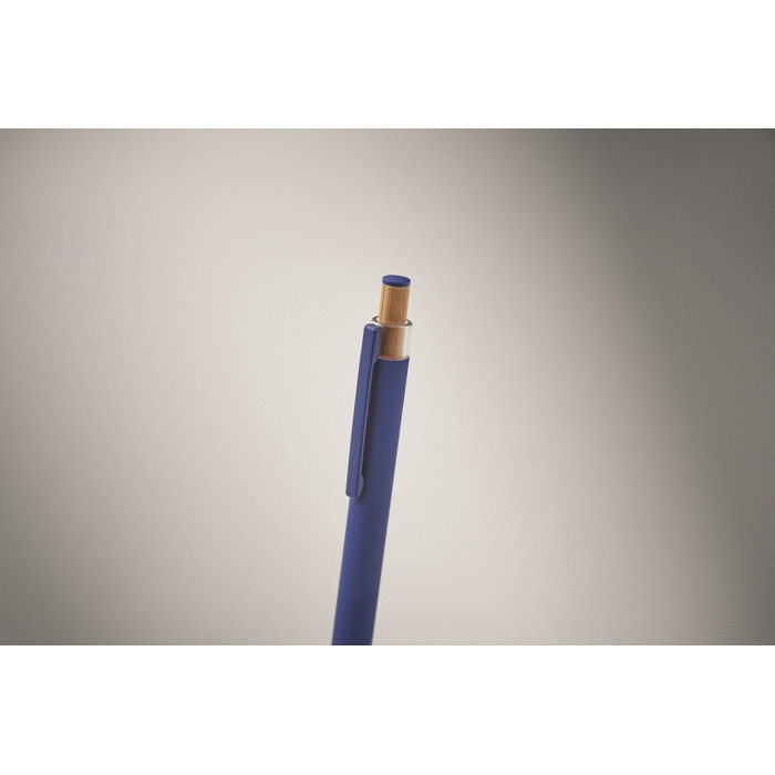 Caneta de alumínio reciclado com botão de bambu. Detalhe colorido e clipe metálico a condizer. Tinta azul.